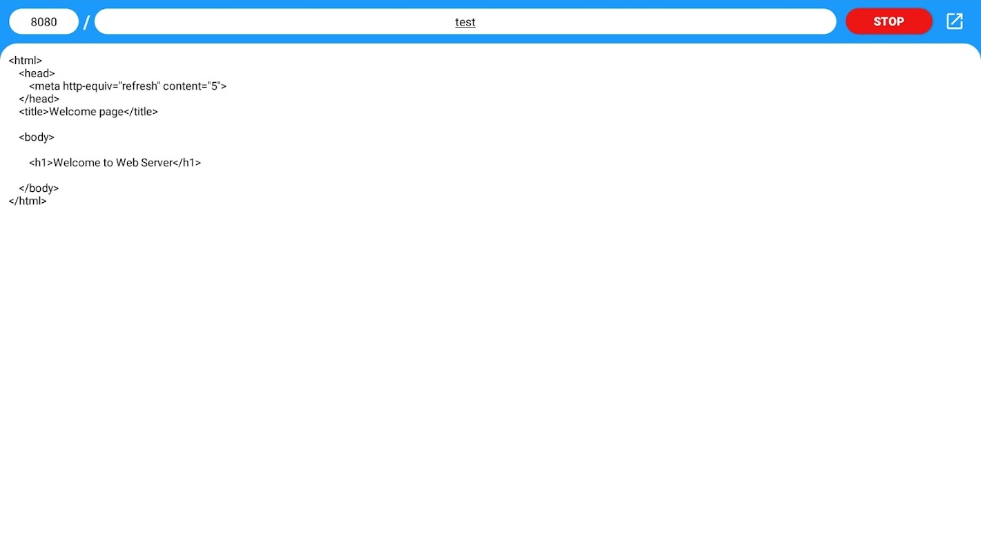 Máy chủ Web cho phép bạn dễ dàng biến thiết bị của mình thành máy chủ web cục bộ! Nhập số cổng, đường dẫn URL (ví dụ: /test) và mã HTML, CSS và JavaScript của bạn. Nhấn BẮT ĐẦU, và thiết bị của bạn sẽ lưu trữ trang web ngay lập tức trên mạng Wi-Fi.