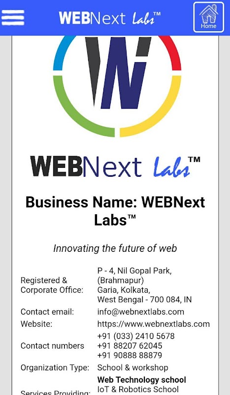 WEBNext Labs is a Kolkata based ISO 9001:2015 certified web designing and development school imparting knowledge on Web Technology, IoT, Robotics entrepreneurship and numerous other skills. This school is registered with Government of Indian under the MSME(Ministry of Micro, Small and Medium Enterprise) Act. Apart from teaching and training we also help our clients flourish through our web-based solutions and legal services.