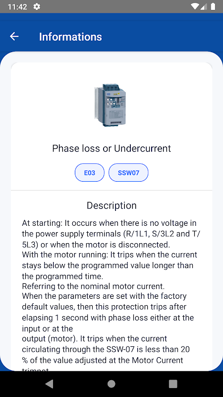 WEG đã sản xuất ứng dụng này để giúp khách hàng xác định lỗi và báo động mã số trên biến tần của họ và bắt đầu mềm. Sử dụng ứng dụng này để xác định lỗi và báo động kết hợp với đầy đủ các dòng sản phẩm tự động hóa sản xuất bởi WEG và để xác định nguyên nhân có thể cho các báo động.