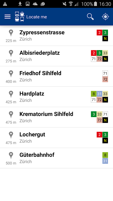 Dừng có thể dễ dàng được chọn từ một danh sách hoặc có thể được tìm thấy bằng cách sử dụng „Xác định vị trí của tôi. Thời gian khởi hành được tự động cập nhật. Sau khi lựa chọn tuyến vận chuyển, toàn bộ tuyến đường với thời gian khởi hành được hiển thị cùng với các kết nối có thể.