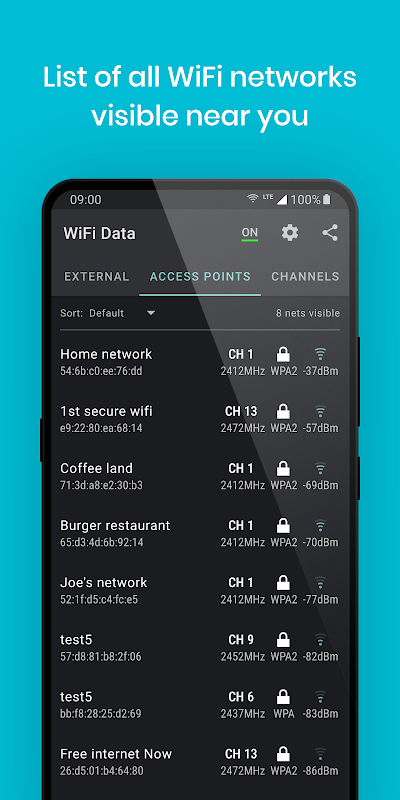 2) Tab danh sách điểm Acces - danh sách tất cả các điểm truy cập mạng hiển thị cho thiết bị của bạn. Mỗi hàng mô tả một mạng với tên, kênh, bảo mật và cường độ tín hiệu. Bạn có thể sắp xếp danh sách này theo mọi thuộc tính và khám phá các mạng xung quanh bạn!