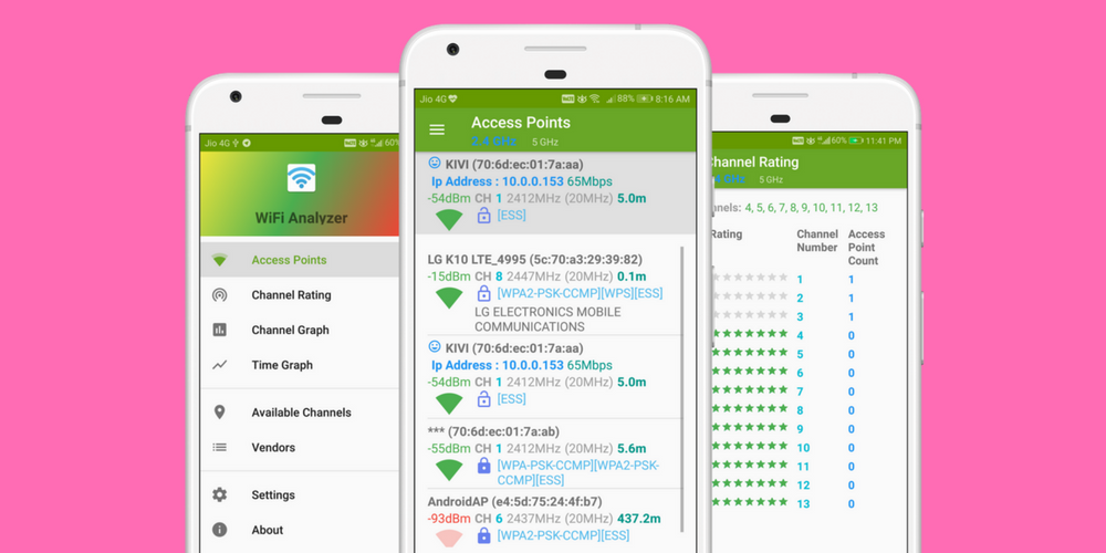 ứng dụng WiFi Analyzer sử dụng để tối ưu hóa wifi Networks bởi sức mạnh quét tín hiệu, tín hiệu đông đúc, giá kênh, khoảng cách ước tính và hơn nhiều.