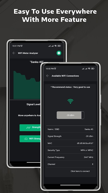 Ứng dụng Máy đo cường độ tín hiệu WiFi giúp người dùng phát hiện tín hiệu wifi mạnh trong thời gian thực. Nó hoạt động bằng cách phát hiện Cường độ tín hiệu WiFi xung quanh bạn trong thời gian thực và biểu thị cường độ tín hiệu wifi ở chế độ xem đồ họa. Chế độ xem đồ họa về cường độ tín hiệu wifi giúp người dùng phân tích cường độ tín hiệu wifi một cách dễ dàng. Và chiến lược này giúp người dùng tìm thấy mạng kết nối wifi mạnh.