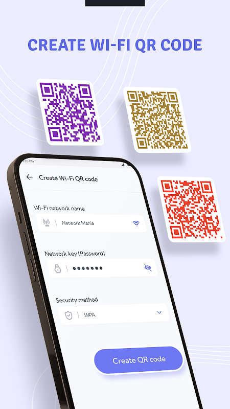 Tất cả trong một, ứng dụng giúp tạo Mã QR Wi-Fi của riêng bạn với bảo mật bằng mật khẩu và quét nó để kết nối mạng Wi-Fi trực tiếp.