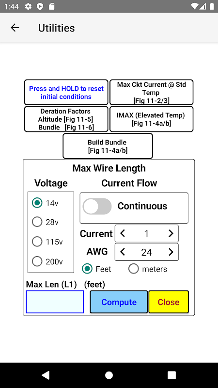 Ứng dụng này hỗ trợ thợ máy máy bay (A&P) xác định kích thước dây Máy đo dây của Mỹ (AWG) chính xác cho các điều kiện nhất định, theo các quy trình được nêu trong Ấn phẩm FAA AC 43-13 1B (Phương pháp, kỹ thuật và thực hành được chấp nhận - Kiểm tra và sửa chữa máy bay ), Chương 11.