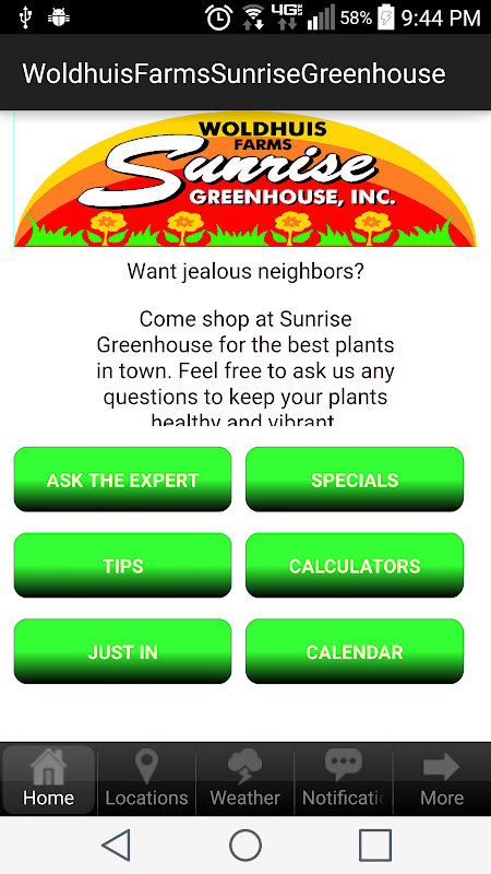 With this new app, you will be able to stay in touch with what is happening at Sunrise Greenhouse! You can view our sales, use coupons, read tips for gardening, calculate how much mulch you need for your garden beds, and ask us any and all questions right from this one app! It's a great app to make your landscape the envy of all your neighbors!