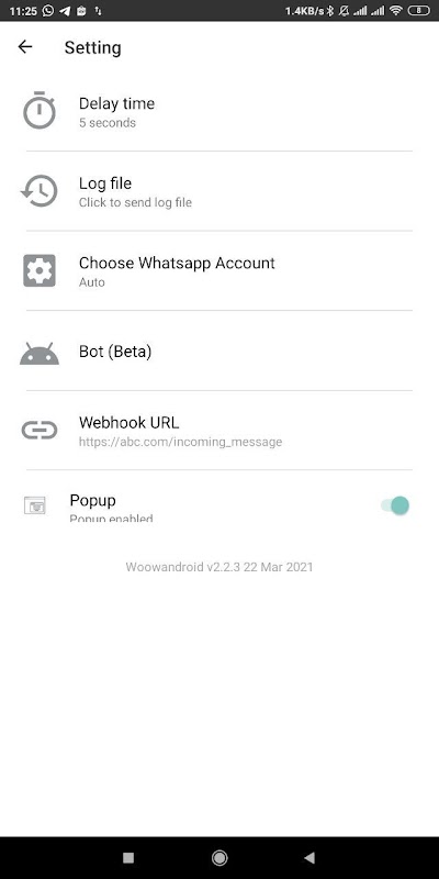 • Woowandroid thu thập tin nhắn đã chuyển tiếp từ Woowandroid tới Whatsapp, bạn có thể xem dữ liệu trên menu lịch sử và có thể xóa dữ liệu đó.