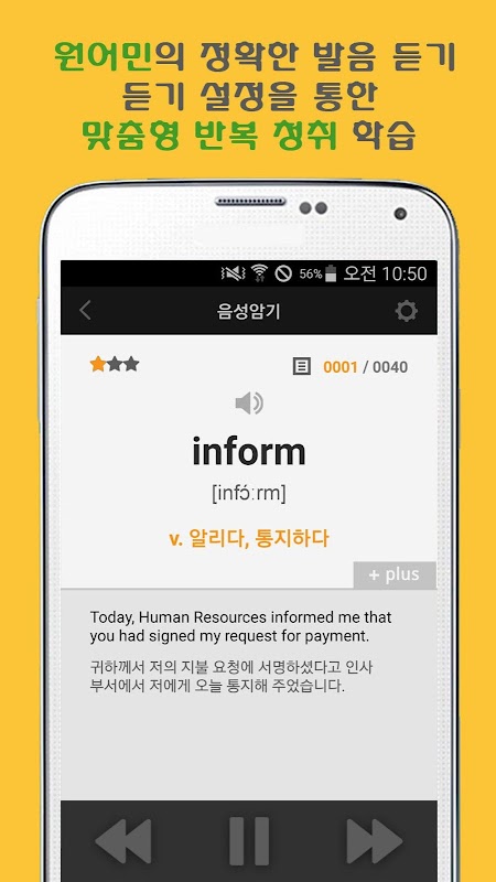 총 2000단어에 대한 원어민 음성을 통해 정확한 발음 듣기는 물론 반복 청취 학습 및 암기가 가능합니다. 또한 듣기설정을 통해 맞춤 듣기 학습이 가능합니다. 자투리 시간을 활용하여 영단어를 학습하세요!