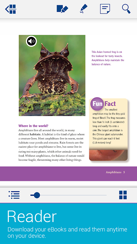 Nền tảng World Book ebook bao gồm một thư viện phong phú các danh hiệu được minh họa đẹp cho mọi lứa tuổi và sở thích. Bạn có một fan hâm mộ động vật? Tìm hiểu factoids động vật tuyệt vời trong loạt Animal Lives! Nghĩ không gian là khá mát mẻ? Trở thành một chuyên gia về các lỗ đen, các hành tinh ngoài hành tinh, và nhiều hơn nữa bằng cách đọc sách trong Khám phá loạt vũ! Là truyện tranh điều bạn? Hành trình về toán và khoa học tự nhiên cuộc phiêu lưu với các nhân vật chính trong loạt Building Blocks!