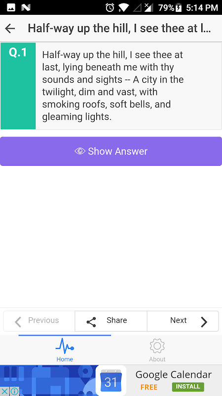 2. Cung cấp một tùy chọn để thực hành câu trả lời của riêng bạn như là ứng dụng sẽ trình bày của bạn với Riddles. Bạn có thể nghĩ rằng câu trả lời của ông sau đó so sánh câu trả lời của ông như thế nào là khác nhau từ câu trả lời của chúng tôi.