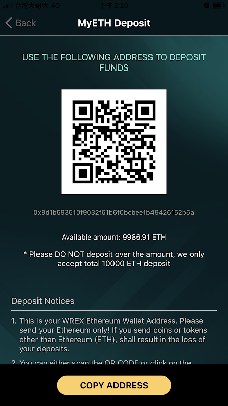 Transferring 1 and up to 100 ETH into from My ETH Wallet to WREX Account and maintaining minimum 1 Ethereum in WREX Account is important to receive Affiliate Bonus, obtain monthly return and to create/maintain multiple 100 ETH PLAN.