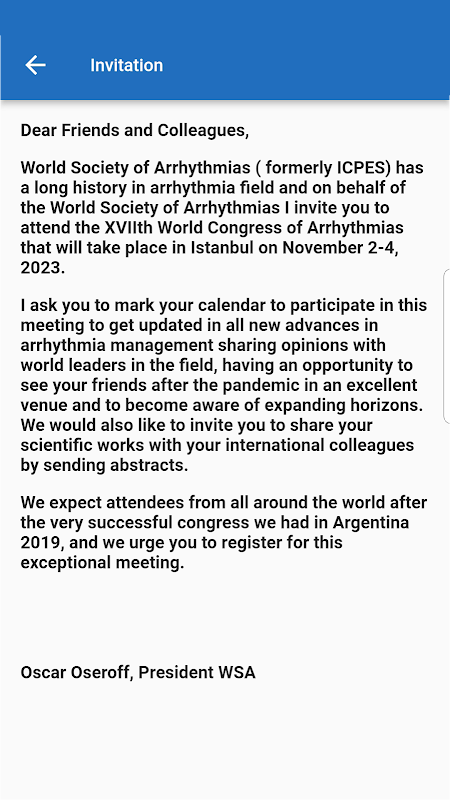 Hiệp hội Rối loạn nhịp tim Thế giới (trước đây là ICPES) có lịch sử lâu đời trong lĩnh vực rối loạn nhịp tim và thay mặt Hiệp hội Rối loạn nhịp tim Thế giới, tôi mời bạn tham dự Đại hội Chứng loạn nhịp tim Thế giới lần thứ XVII sẽ diễn ra tại Istanbul vào ngày 2-4 tháng 11 năm 2023.