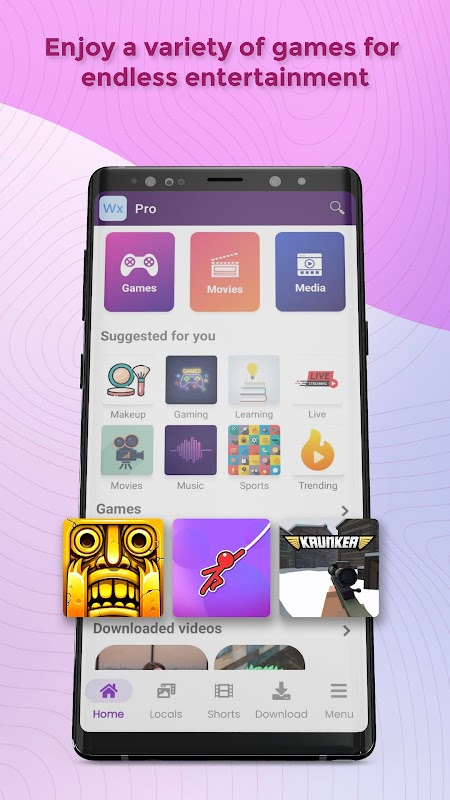 Biến thiết bị Android của bạn thành trung tâm giải trí đỉnh cao với WX Player Pro. Truyền phát, tải xuống và phát - tất cả trong một trải nghiệm liền mạch. Cho dù bạn đang xem video ở chế độ HD tuyệt đẹp, tải xuống phương tiện yêu thích hay đắm mình trong các trò chơi trực tuyến và ngoại tuyến thú vị, WX Player Pro đều có tất cả.