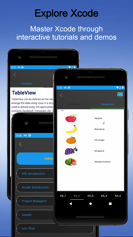 Bài học về nhiều ví dụ: Trải nghiệm các tình huống đa dạng với hơn năm ví dụ trong mỗi hướng dẫn Xcode.