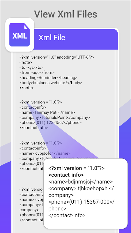 Xml File Viewer là ứng dụng đọc và xem tệp dành cho thiết bị Android. Xml Viewer cho Android cho phép người dùng mở và xem các tệp HTML, JAVA, JSON và TEXT. XML Viewer cho Android là trình xem tệp thân thiện với người dùng vì người dùng có thể truy cập tất cả các tệp trên thiết bị của họ bất kỳ lúc nào. Xml Viewer là tất cả trình mở và đọc tệp cho phép người dùng quản lý tệp XML và các tệp khác của họ. Trình xem tệp XML dành cho android này giúp bạn tạo thêm dung lượng lưu trữ trong thiết bị của mình. Xml Viewer và Xml reader sẽ đặt các tệp Html, Java, Json, Văn bản và Xml trong các thư mục cụ thể của chúng. Trình đọc XML cung cấp khả năng truy cập dễ dàng vào tất cả các tệp cho người dùng vì chúng được sắp xếp trong các thư mục tương ứng. Hơn nữa, tất cả các tệp được cập nhật tự động trong các thư mục của chúng. XML Viewer dành cho Android là một công cụ dễ dàng truy cập để đọc các tệp java và txt trong học viện.