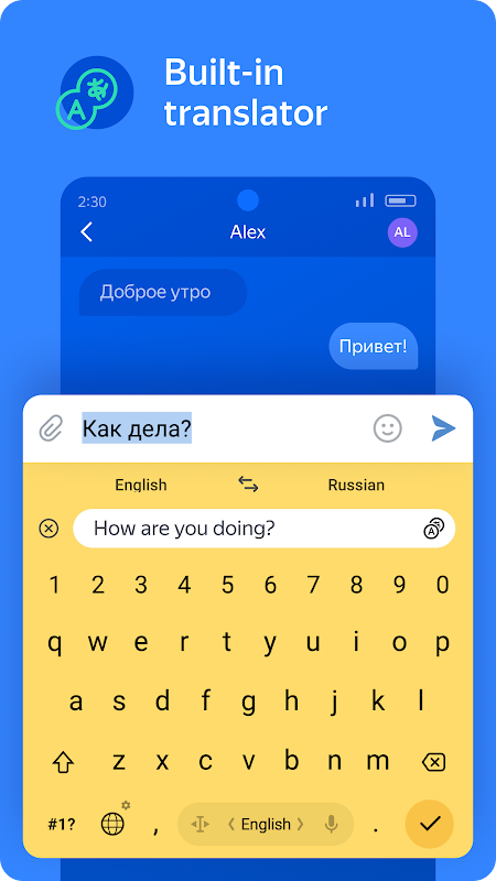Bạn có thể thay đổi thiết kế của bàn phím: làm cho bàn phím sống động và nhiều màu sắc hoặc chọn kiểu thiết kế bàn phím tối màu hơn và bóng mượt hơn. Đừng lãng phí thời gian của bạn vào việc chuyển đổi và vuốt: thêm số và các ký tự phụ khác vào bố cục bàn phím chính của bạn để tiếp cận tức thì. Nếu bạn cần truy cập Internet để được trợ giúp, tính năng tìm kiếm tích hợp sẵn của Yandex luôn ở ngay đầu ngón tay bạn.
