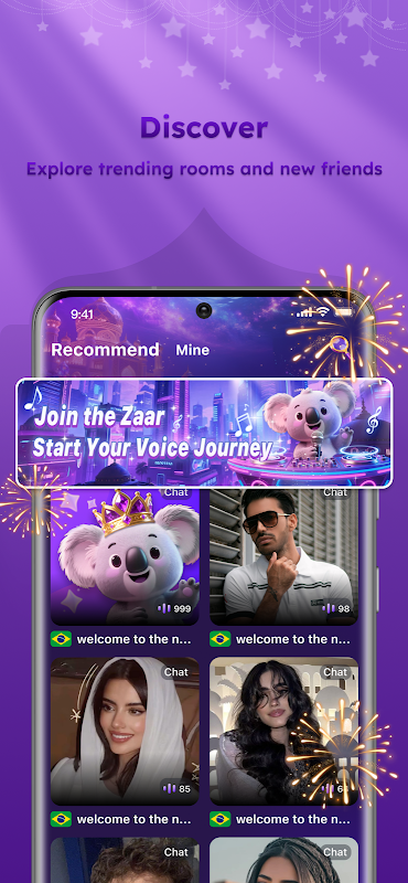 Trên Zaar, bạn có thể tham gia các phòng trò chuyện thoại theo chủ đề, trò chuyện với những người cùng chí hướng, tận hưởng các sự kiện tiệc tùng sôi động hoặc kết nối riêng tư với bạn bè trong một không gian ấm cúng, an toàn.