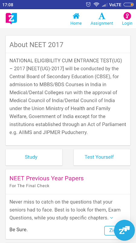 Sinh viên và các nhà giáo dục có thể tìm thấy những câu hỏi và câu trả lời dựa trên các chủ đề và các kỳ thi năm trước quan trọng. Sinh viên có thể chuẩn bị kỳ thi cạnh tranh Jee Main, NEET, CLAT và SSC CGL. Zigya cung cấp Tự kiểm tra và thử nghiệm Mock cho sinh viên để kiểm tra việc chuẩn bị của họ.