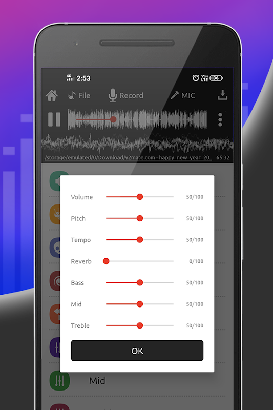 - Custom sound with effects: echo, reverb, pitch, tempo, volume, bass, mid, treble.