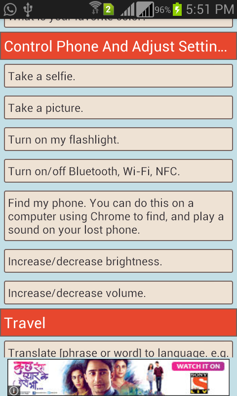 This app contains Voice Commands for your android device....