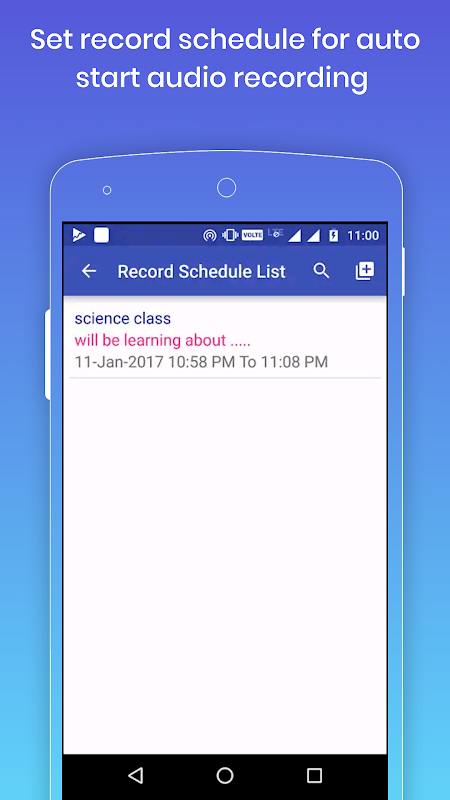 "Schedule voice recorder" or "Voice Recorder": Now Record your voice ,audio ,sleep and FM radio . You are in hurry and does not listen your opponent carefully. Don't worry, Record all your voice ,audio and FM radio easily and can listen later. you can can share call recordings with anyone.You can schedule your voice record so it will be start recording voice automatically at schedule time.