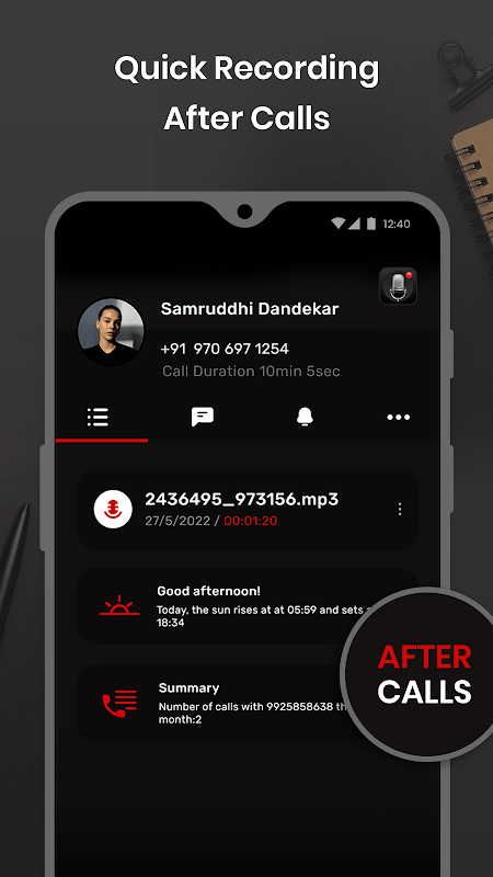 Smart Recorder High-quality Audio Recorder is a voice recorder app that provides an easy and wonderful recording experience with high-quality sound. You can use it for your everyday needs, such as recording notes, memos, meetings, interviews, lectures, songs, and more. You can also convert your voice to text (Speech to text) and edit your audio files.See your latest Voice Recording entries along side call information after every call.