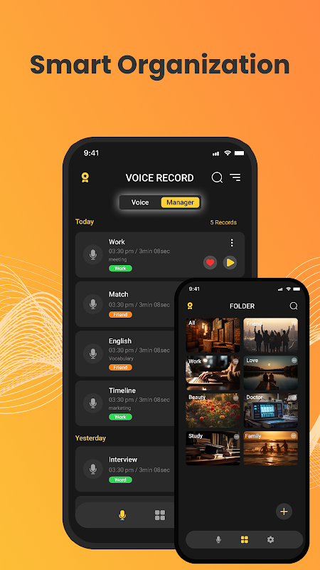 5. Smart Organization: Managing your recordings has never been easier. Voice Recorder employs intelligent organization features that categorize your audio files by date, location, and tags, making it a breeze to find the right recording when you need it.