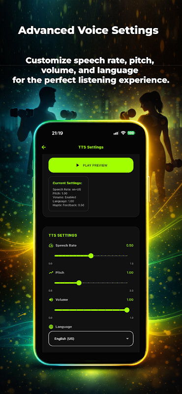 Adjust speech rate, pitch, volume, and language for a calm, personalized coaching experience.