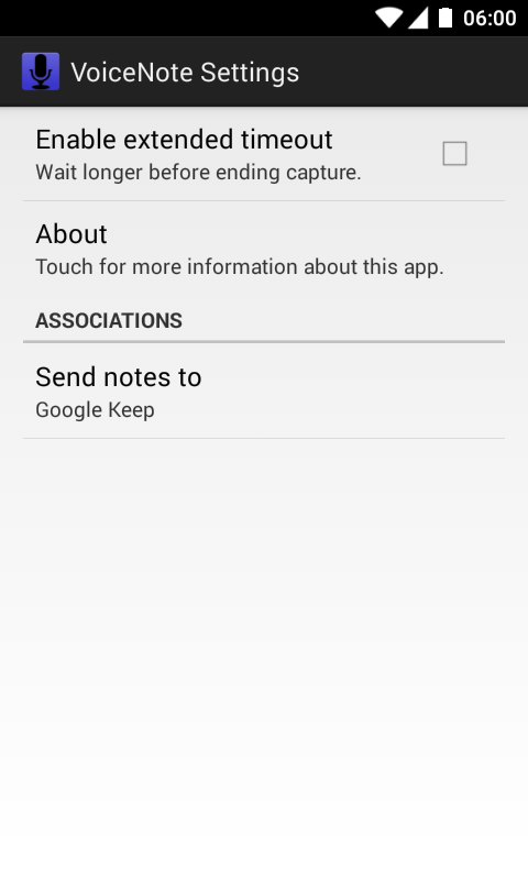NOTE: VoiceNote has no main interface, other than the voice input dialog and the preferences screen. These keywords activate alternate functionality: help, preferences, settings, about.