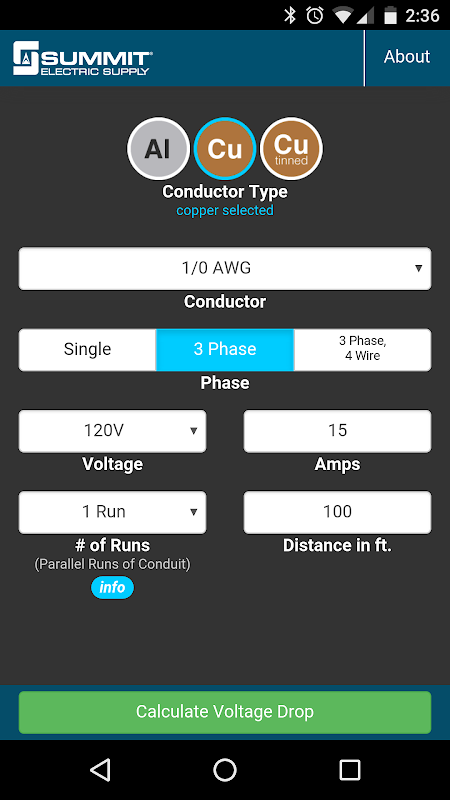 Summit's Voltage Drop Calculator allows you to quickly calculate and share voltage drop for a selected conductor size and type based on the 2014 NEC. This simple and easy-to-use calculator delivers professional results for any size job or project. Simply select your conductor then enter your voltage, amperage, phase, distance, and number of runs to determine the new voltage and percentage dropped. You’ll get instant results for each calculation that includes the formula used as well as detailed technical information.