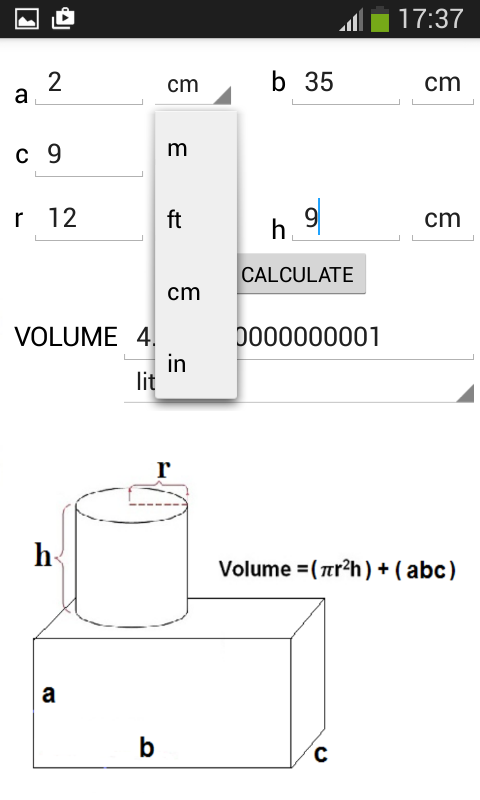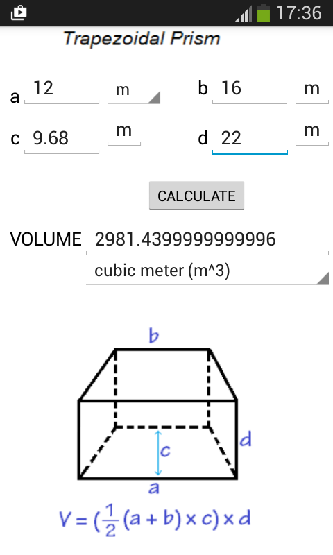 This app is a calculator for volume, you can calculate the volume of cube, cube+tube, cone, rectangular, cylinder, sphere, triangular prism, pyramid rectangular base, tetrahedron, cone bottom silo, capsule, rectangular + rectangular, rectangular + cube, rectangular + cone, hollow rectangular, hollow tube, hollow cylinder, frustum of a cone, trapezoid.