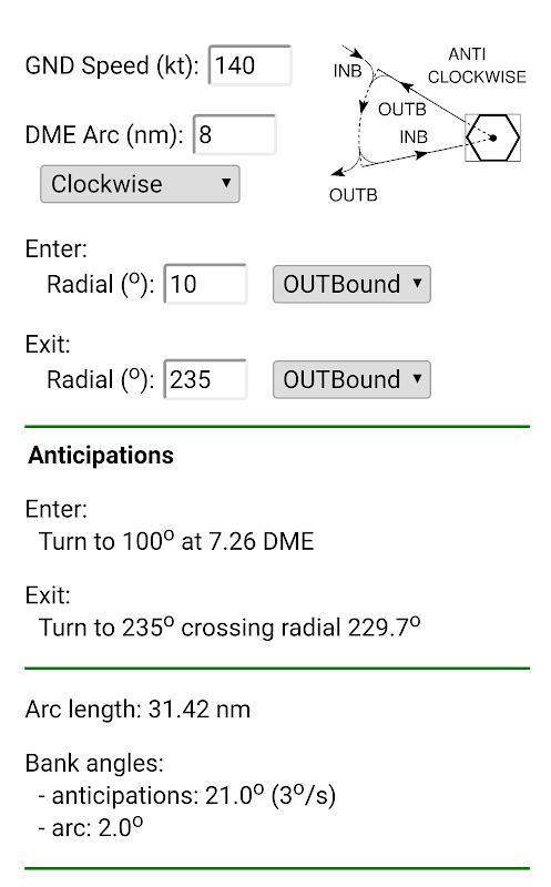 Determines the anticipations to enter and to exit a VOR/DME arc. The arc is defined by the DME, by two radials (in and out) and a direction; clockwise or anticlockwise. Entering or exiting the arc can be done inbound the station or outbound the station. The anticipation turns are to be performed with a standard rate of turn (3 deg/sec) according to the speed. The (zero wind) angle of bank to be maintained during the arc is also determined.