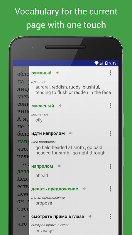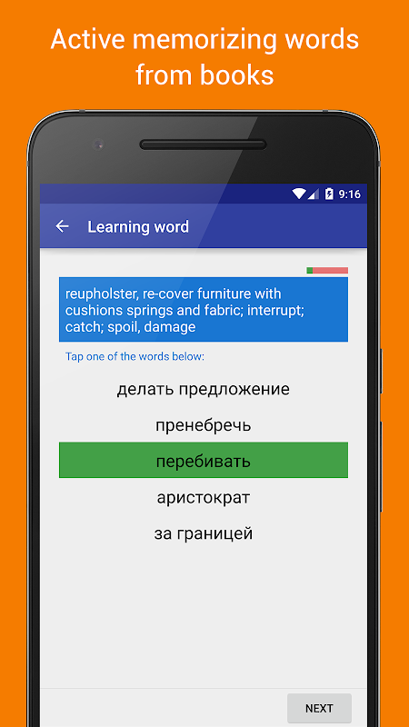 When reading, if the book is in foreign language, the app highlights unknown words and builds a dictionary for the current page to explore and learn these words. Also it offers for learners a special active memorization procedure for the unknown words and phrases from the reading books.