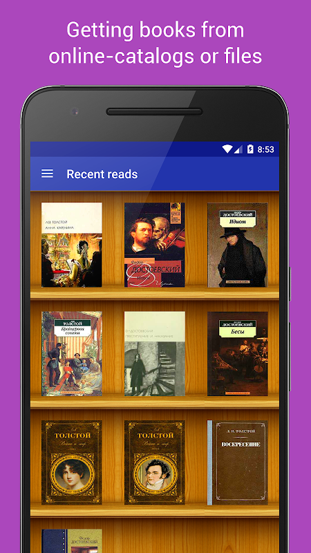- Allows to get books from the online catalogs or from files of the device memory (formats: epub, fb2, html, txt, zip)