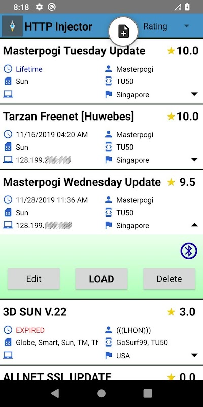 • Configs can be sorted according to Rating, Expiration, Network, etc.