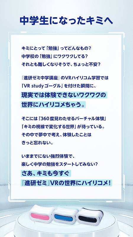 This is an app for 2025 "Shinkenzemi Junior High School 1st Course" hybrid style/junior high school integrated style members. We will deliver VR content to be viewed with .