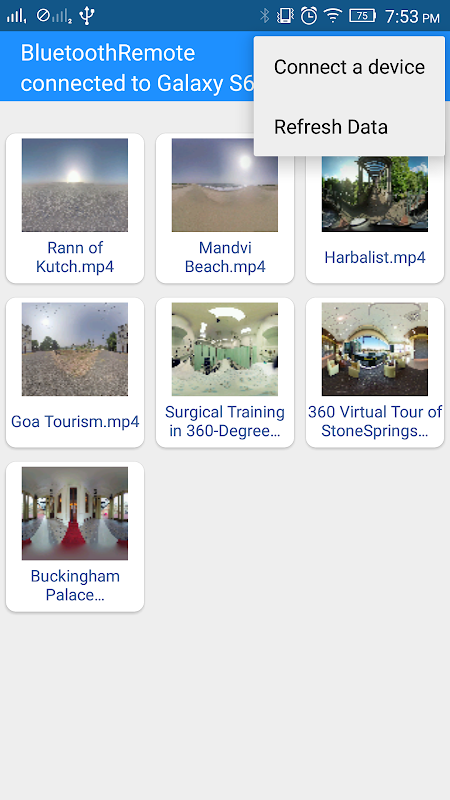 Once connected, The Remote app will fetch data from the Player, This data will be fetched from one predefined folder(“VrBluetoothVideos”) from the SD card of the device.