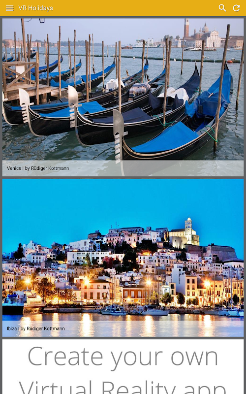 Experience beautiful places, such as Ibiza and Lago Maggiore, as if you're really there. Use a Google Cardboard, Zeiss VR One, or other VR headset to start your holiday from your own couch or swivel chair. New destinations are added regularly, so feel free to come back anytime.