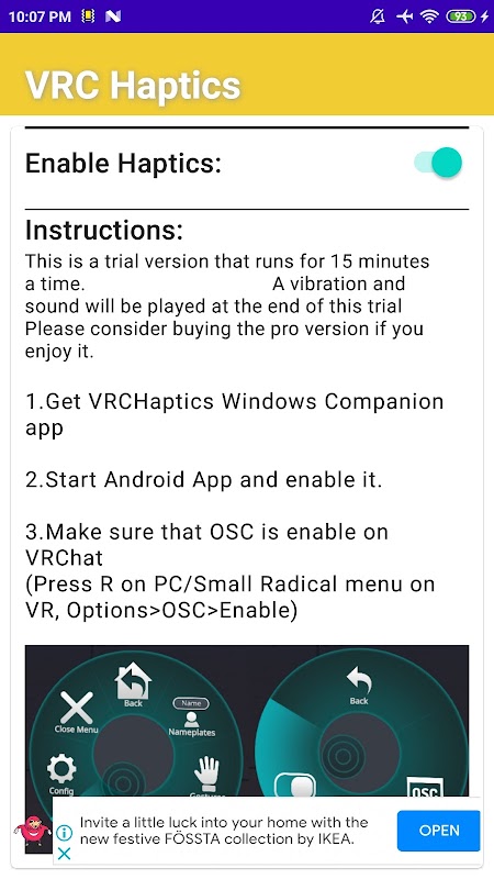 This application is to use with it's desktop companion app to communicate data from VRChat desktop to the phone. The desktop application receives OSC interaction messages from VRChat and sends over signals to vibrate the phone. This is a trial version that only last for 15mins per session, Do consider buying the Plus version in the future if you enjoy it.
