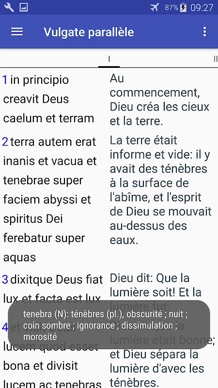 Vulgate française / latine parallèle avec des définitions de dictionnaire pour chaque mot latin.