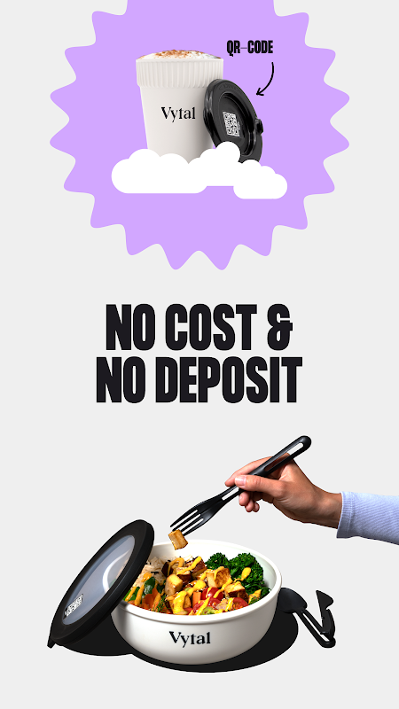 Picture this: a network of partners, vibrant restaurants, and cozy cafeterias, all ready for you to grab your food in our sustainable Vytal containers. Enjoy your meal, savor the moment, and then simply return the containers at your leisure. The best part? It's free for you!