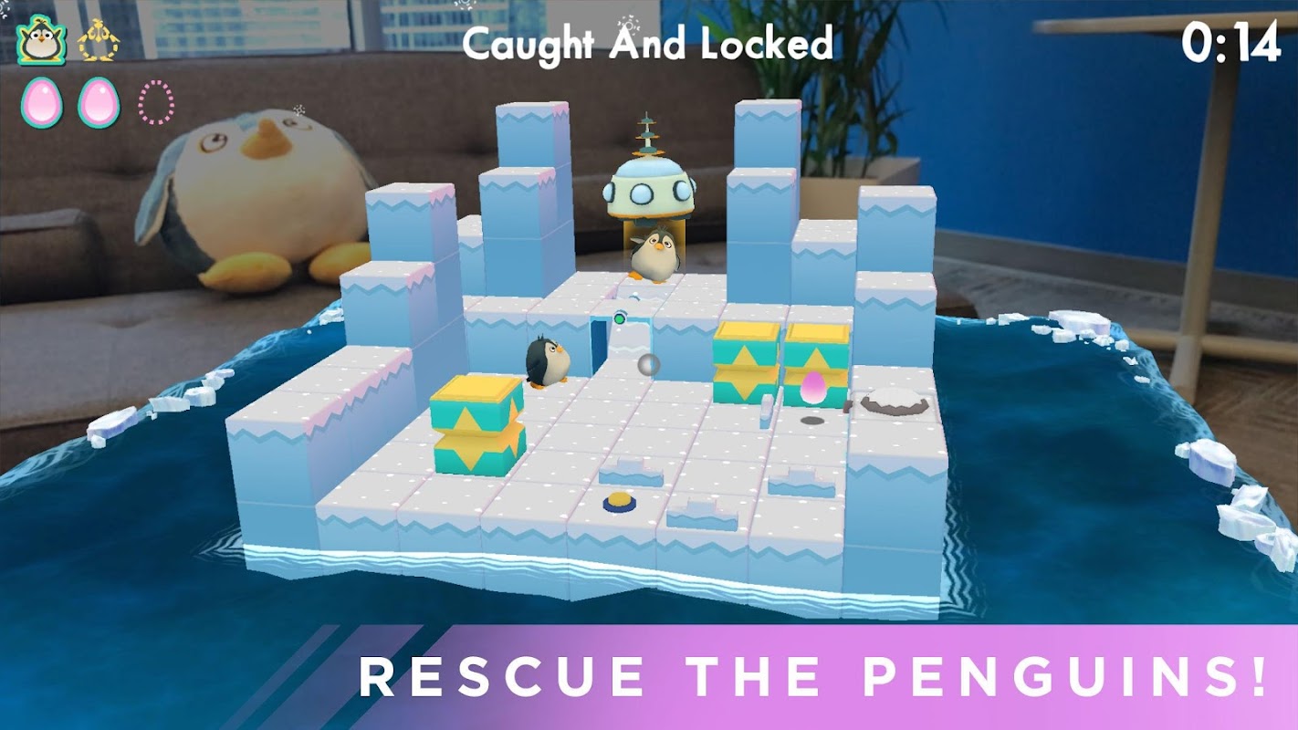 An adorable arctic rescue in AR! The little penguin family of Waddle Home have lost their way, and it's up to you to guide these roly-poly birds back to their spaceship. Help them navigate slippery ice floes by toggling blocks, opening doors, and escaping the ever-patrolling Guard robots. For an added challenge, lead the penguins to collect the pink Bonus Eggs in each level, and bring them back home, too!
