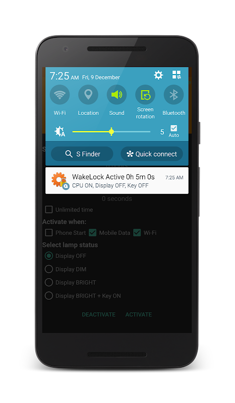 Press Activate button to start the CPU Awake wake lock. Notification will come in status bar when the wake lock is running. Use the Deactivate button to release the lock, at any time, before the time expires.