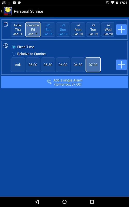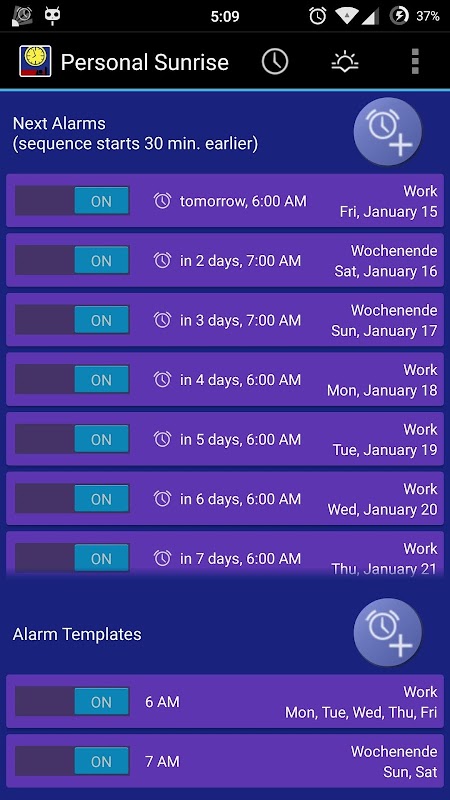 Wikipedia says "Dawn simulation is a technique originally developed to help treat seasonal affective disorder, but can be used as a soundless alarm clock to wake up the body naturally. Typically, the treatment involves timing lights in the bedroom to come on gradually, over a period of 30 minutes to 2 hours, before awakening.". WakeLight offers you several configuration options for the light simulation (sequence length, brightness curve, min/max brightness) and the sound (alarm sound, snooze timing and sound) in combination with the comfort of periodic alarm templates (with single-alarm removal), and of course single-alarm times. See the pictures. This app is very handy when you're travelling: take your dawn simulation with you!