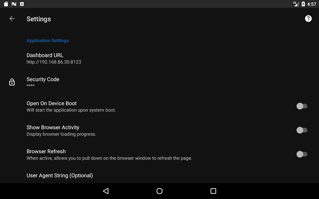 Open the settings by clicking the dashboard floating icon. In the settings, set your web page or home automation platform url. Set the code for accessing the settings, the default code is 1234. You will need this code to return to the settings, so remember it!