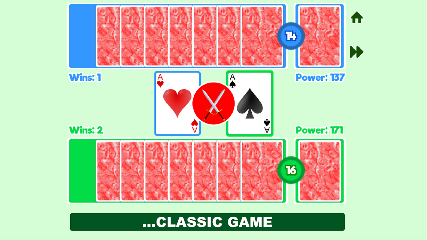 In the event that the two cards played have equal value, a "war" occurs. Depending on the settings, 1 to 15 cards are placed on the table, and once again, the player with the higher card wins the "battle" and takes all the cards involved.