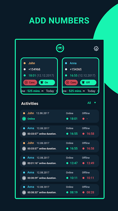 Report your activity times and instant actions. Analyze online deadlines that online and offline tracker and usage. When is the last seen? Detect how many minutes.