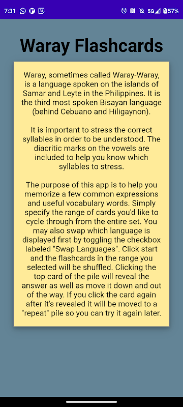 The purpose of this app is to help you memorize a few common expressions and useful vocabulary words in the Waray language, also called Waray-Waray. To use the app, simply specify the range of cards you'd like to cycle through from the entire set. You may also swap which language is displayed first by toggling the checkbox labeled "Swap Languages". Click start and the flashcards in the range you selected will be shuffled. Clicking the top card of the pile will reveal the answer as well as move it down and out of the way. If you click the card again after it's revealed it will be moved to a "repeat" pile so you can try it again later.
