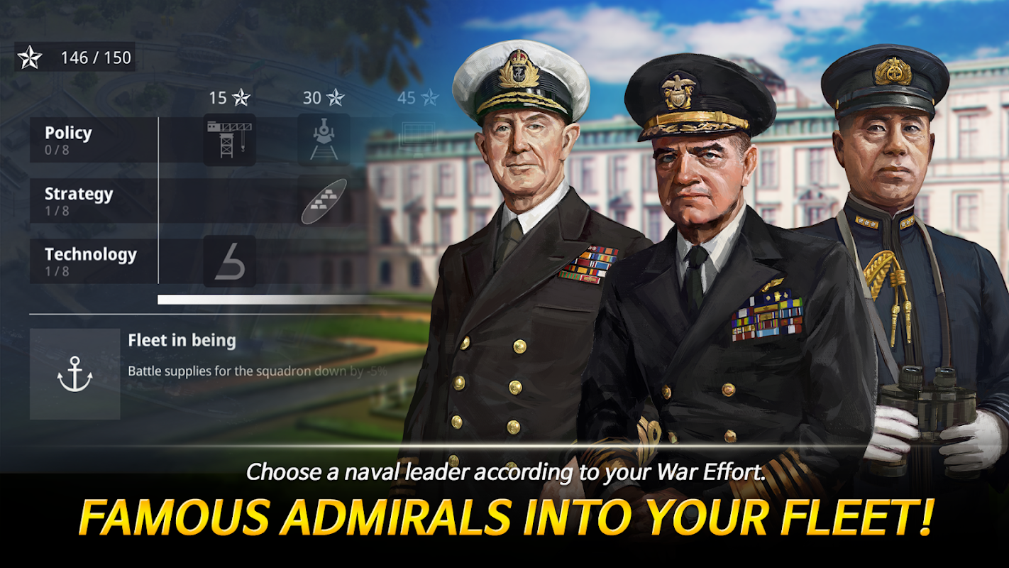 Form a fleet of up to 70 ships and conquer the sea. You can create the strongest squadron with ships of various nationalities such as german Bismarck, IJN Musashi, and USS Gearing.