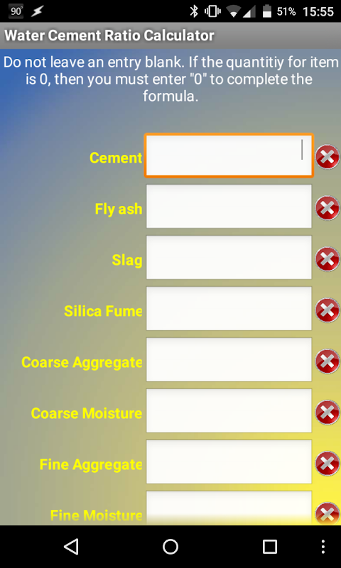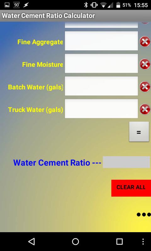 Water Cement Ratio Calc is a fast and easy way to calculate water cement ratio without all of the long hand written processes. If you are a QC/QA/VT this app will come in handy for giving you quick results while working in a fast pace environment. This app has the added benefit of being able to add cement, fly ash, slag, and silica fume to your calculation.
